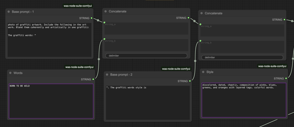 How do I implement a prompt template in ComfyUI? It is a brute-force method of concatenating two strings repeatedly using the Multiline TextBox (from the Was Node Suite) node and the Concatenate native node.