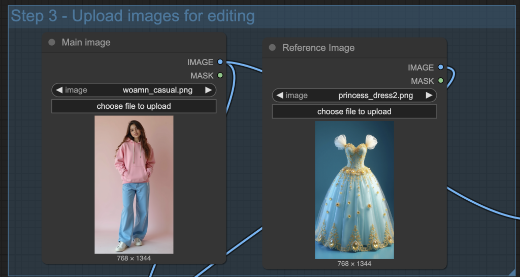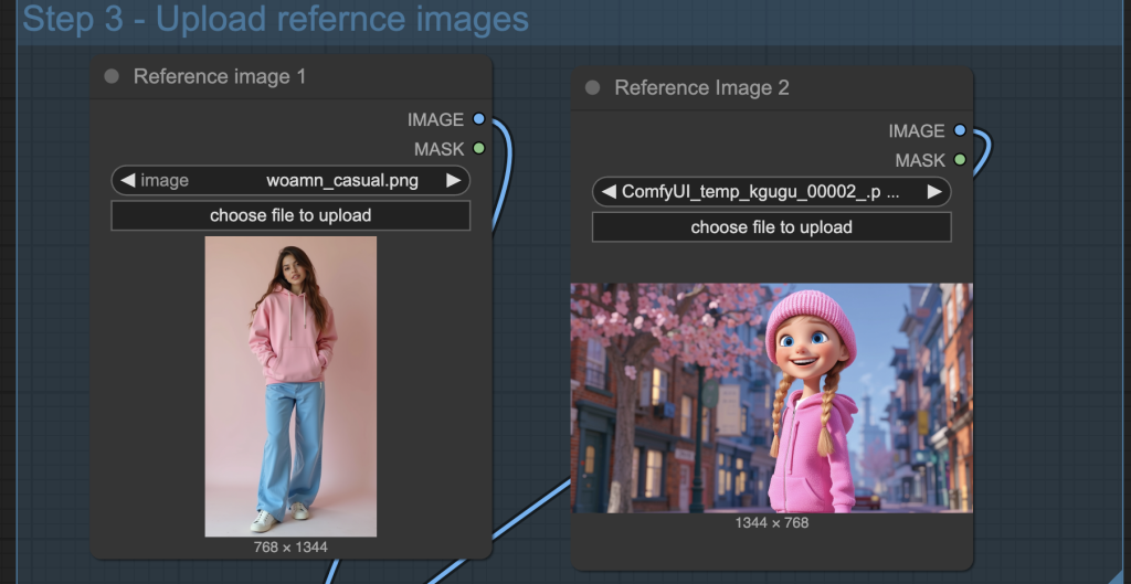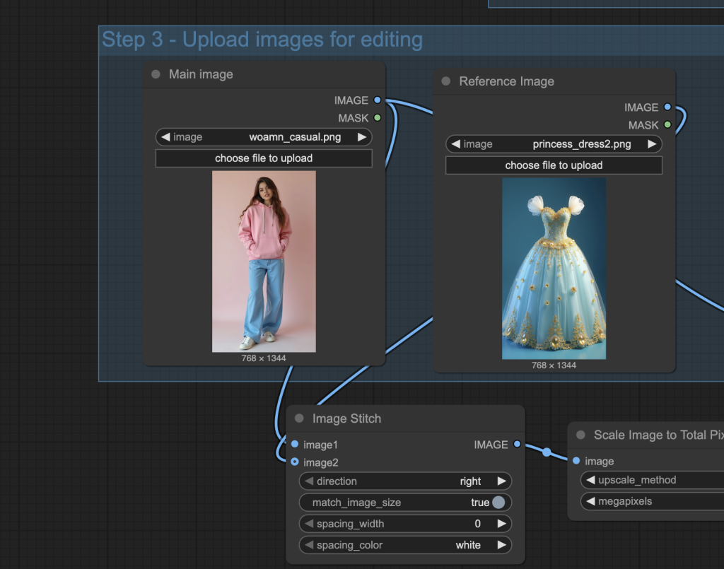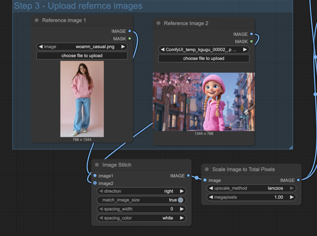 Similar to the previous workflow, the two reference images are combined side-by-side using the Image Stitch node, and scaled down to 1 megapixels before feeding to the Qwen model.
